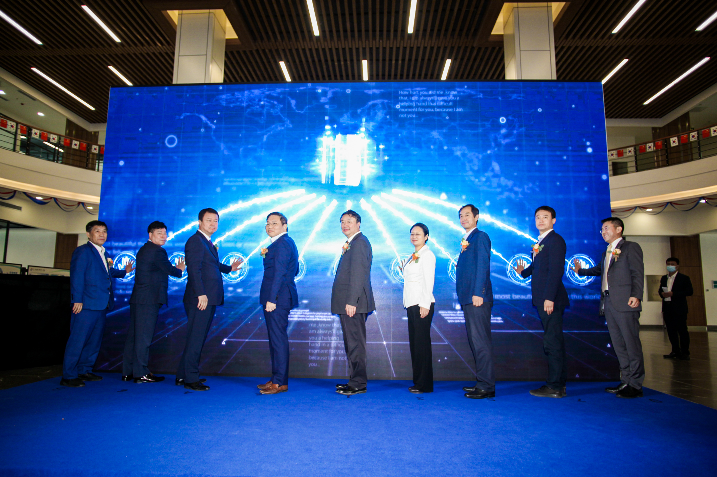 董峰主任、柳浩權(quán)領(lǐng)事與遼寧省商務(wù)廳潘爽副廳長、遼寧省政府外事辦高愛華副主任、遼寧省貿(mào)促會鄭義副會長、韓國大韓貿(mào)易投資振興公社林圣煥館長、沈陽韓國人會安清洛會長、世界韓商大會表成龍會長、豪之英蔡永文董事長等領(lǐng)導(dǎo)嘉賓共同上臺,點亮了象征基地啟動的電子觸摸屏,韓國產(chǎn)業(yè)園成功開園。
